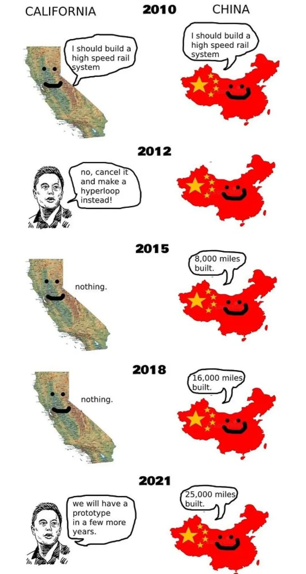 He literally came up with the hyperloop because he was afraid of a high speed rail hurting Tesla sales.